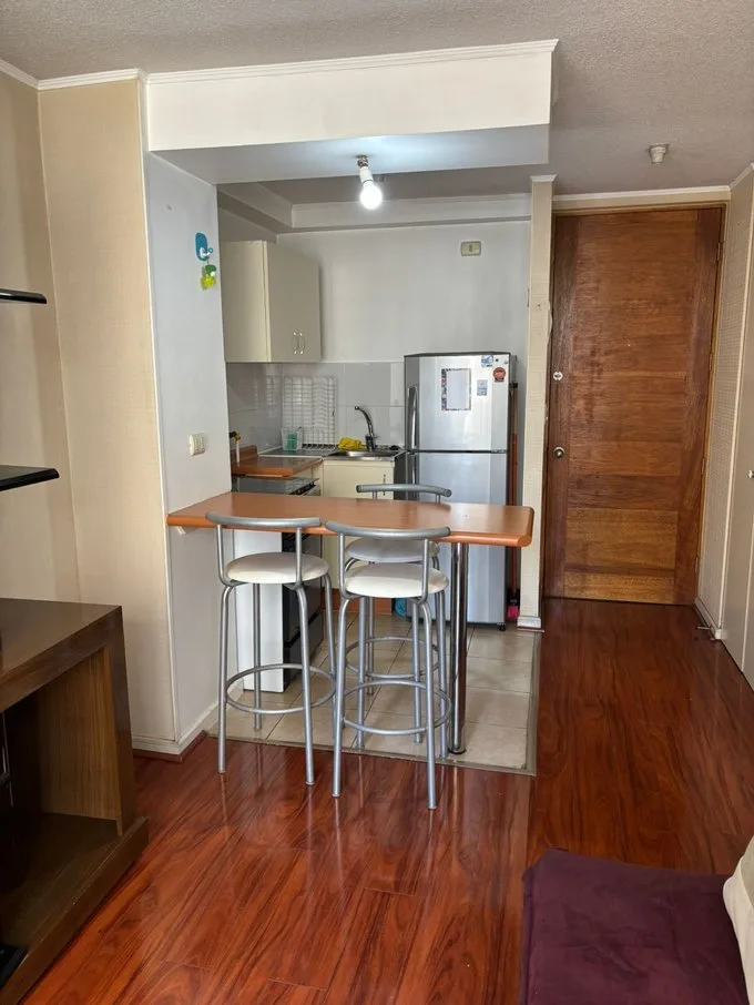 METRO ÑUBLE LINEA 6, Av. Vicuña Mackenna/ Ñuble, lindo departamento en tercer piso, consta de zona de cocina americana amoblada y equipada, 1 dormitorio, 1 baño completo, terraza. Equipado con cocina con horno convencional, refrigerador, futon, rack, dormitorio cama de 2 plazas, lavadora. Sector de gran plusvalía, Metro, frente Sodimac, jardín infantil, amplia variedad de comercio. Edificio equipado con piscina, quincho, sala multi uso, estacionamiento de visitas.