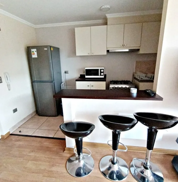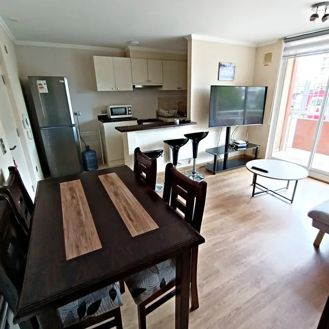 Se ofrece en Arriendo en Villarrica, hermoso junto con cómodo departamento amueblado, en el piso N1, ubicado sector Avenida Segunda Faja al volcán, situado en condominio privado Nueva Lafquen1, conserjería las 24 horas, cercano a Supermercados, colegios, Centro Familiar los Volcanes (Cefam), centros comerciales. Descripción Departamento con una superficie de 52 mts2 aprox. Living Comedor con mesa centro, mesa con 4 sillas, televisor, mueble, sofá 2 dormitorios, con sus respectivos closet y camas de dos plazas 1 baño Cocina estilo americana con muebles de cocina, campana, cocina a gas, refrigerador. Logia con lavadora y secadora Derecho acceso a: Piscina juegos infantiles Quincho Estacionamiento Valor: 420.000.- (Gastos comunes del edificio incluidos)