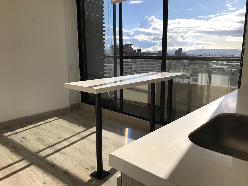 Arriendo apartaestudio, décimo piso, consta de sala comedor en un solo ambiente, con acceso a un balcón, cocina tipo americano, cuarto de lavandería independiente, habitación con closet y baño privado, garaje cubierto y depósito. El edificio cuenta con recepción y ofrece servicios adicionales como terraza BBQ, gimnasio, salón social, Sala de negocios, salón de juegos . Ubicado a pocas cuadras del centro internacional, de las universidades Jorge Tadeo Lozano y Andes. Administración inluida en el canon de arrendamiento.