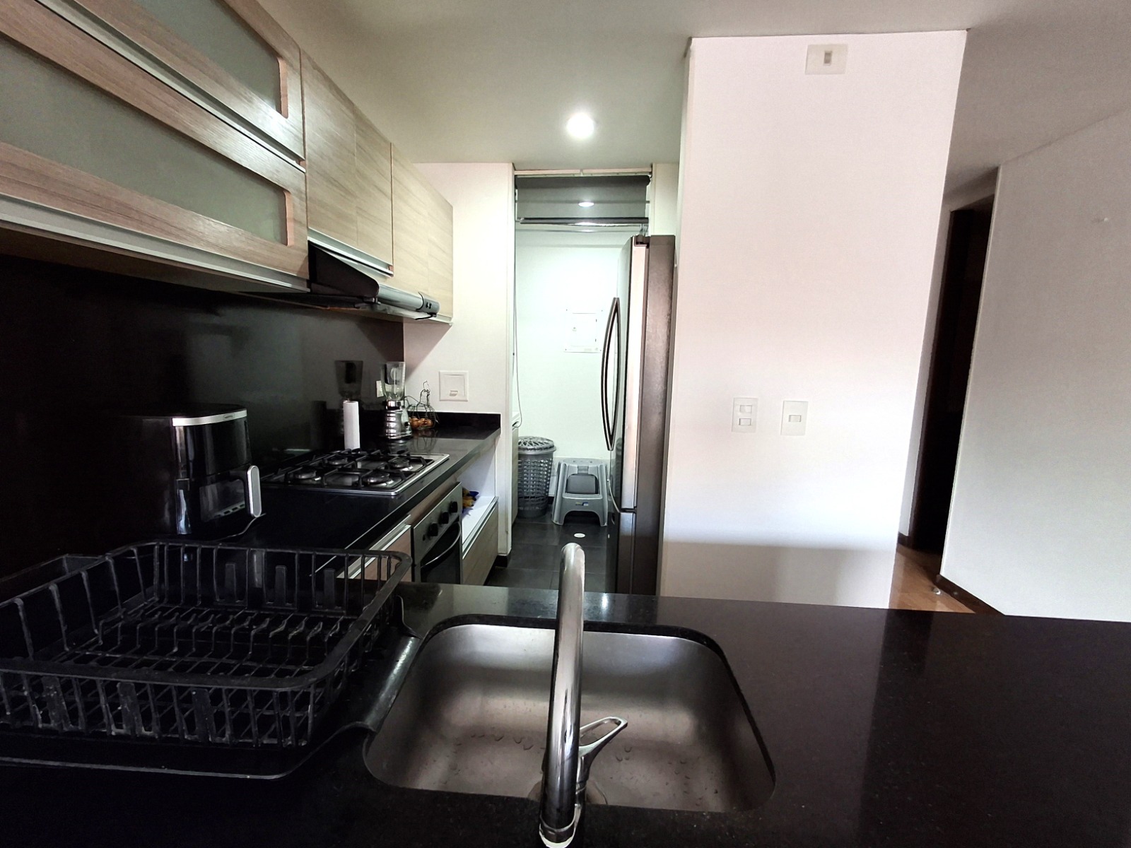 Hermoso apartaestudio, se alquila SIN AMOBLAR, muy iluminado, ubicado en 4to piso de conjunto residencial. Cuenta con sala comedor, cocina abierta tipo americano, baño social, una alcoba amplia con baño privado y patio de ropas. Tiene mueble de pared en madera fina hecho sobre medida en toda la pared de la habitacion. Tiene baño social. Tiene un parqueadero. Tiene cortinas. El conjunto cuenta con zonas sociales como gimnasio, pista de trote, parque infantil, terraza BBQ, lobby y parqueadero de visitantes. Vigilancia 24 horas.