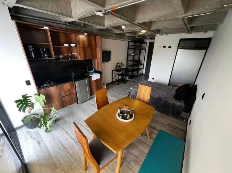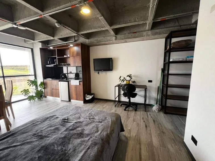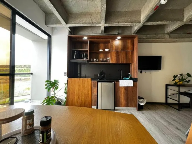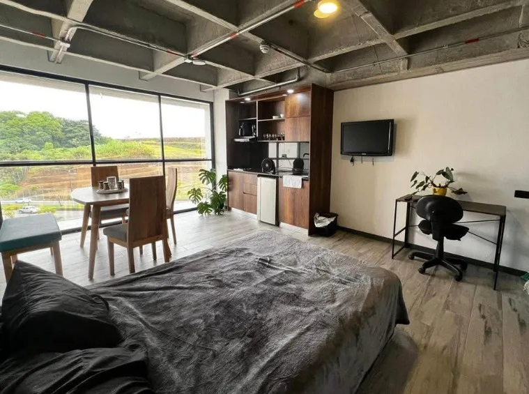 Espacios integrados: sala, cocina equipada y habitación