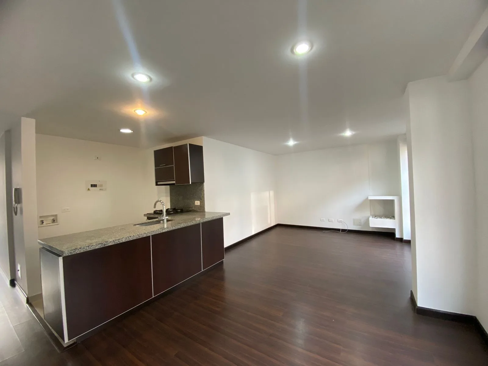 Apto Chapinero alto Barrio El Castillo séptimo piso con vista a la montaña, 58 M2, sala comedor con chimenea, cocina abierta con zona de ropas, una habitación con baño, vestier y balcón con vista a la montaña, pisos laminados, encortinado, caldera agua caliente comunal, un garaje cubierto, un depósito edificio con cancha de squash, salón social, recepción tipo lobby.