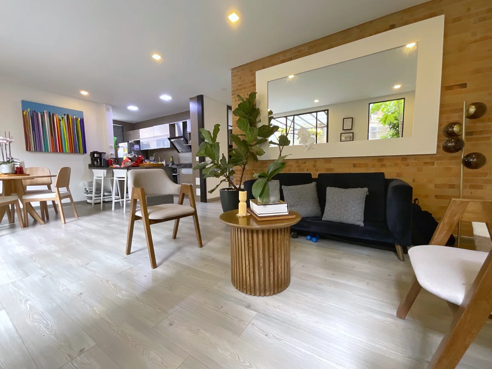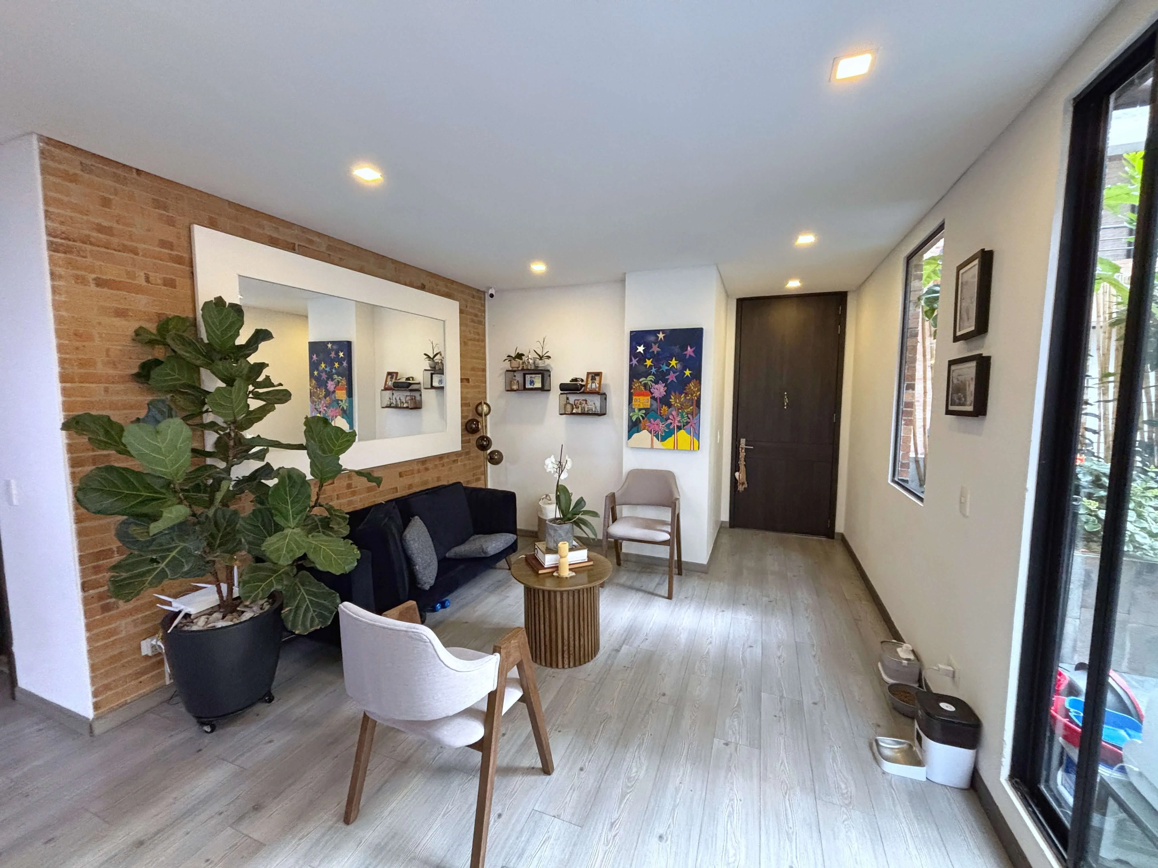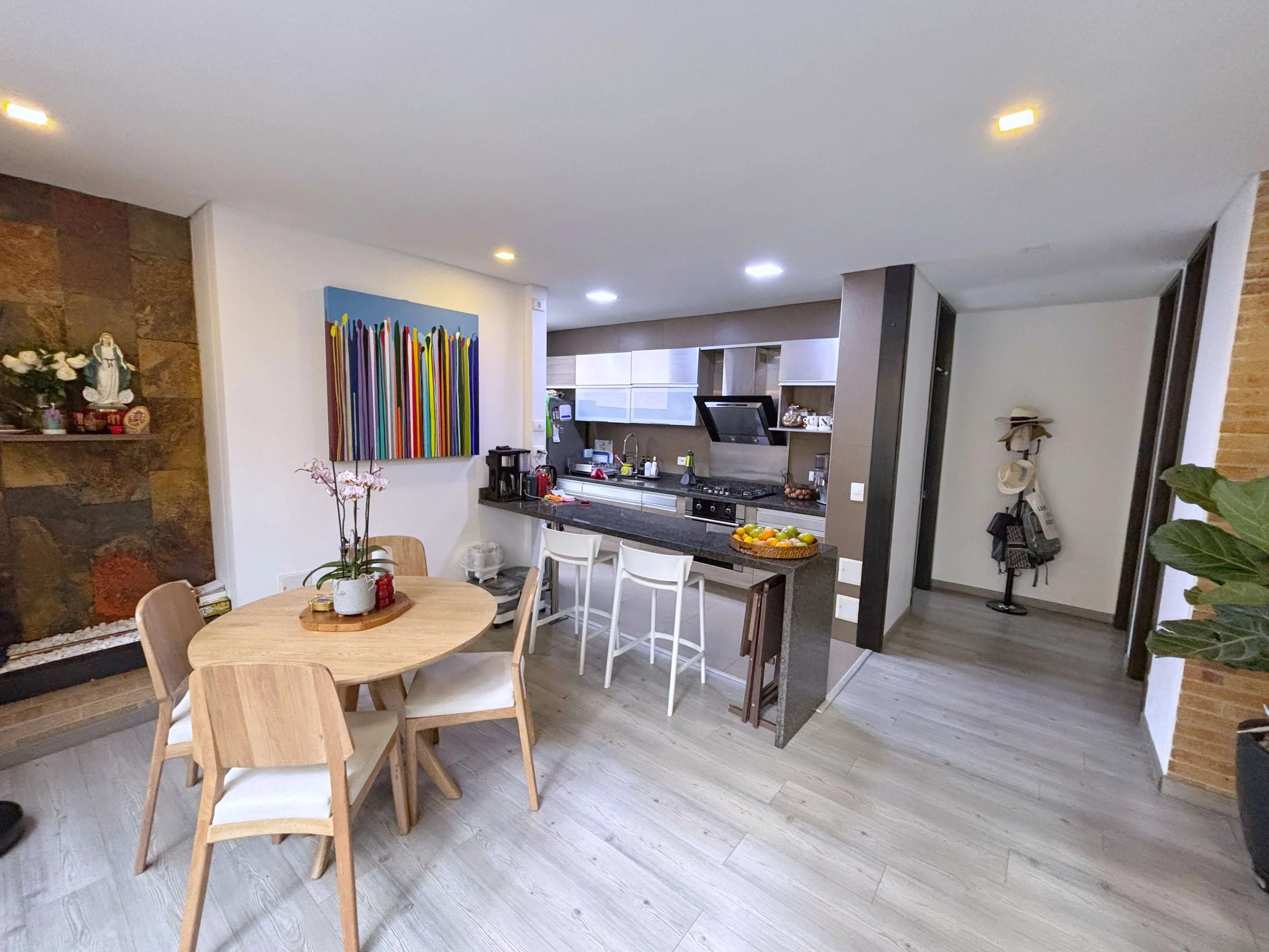 La zona social es amplia, muy iluminada y cuenta con CHIMENEA a gas tanto en la sala como en la terraza, creando un ambiente cálido y acogedor.