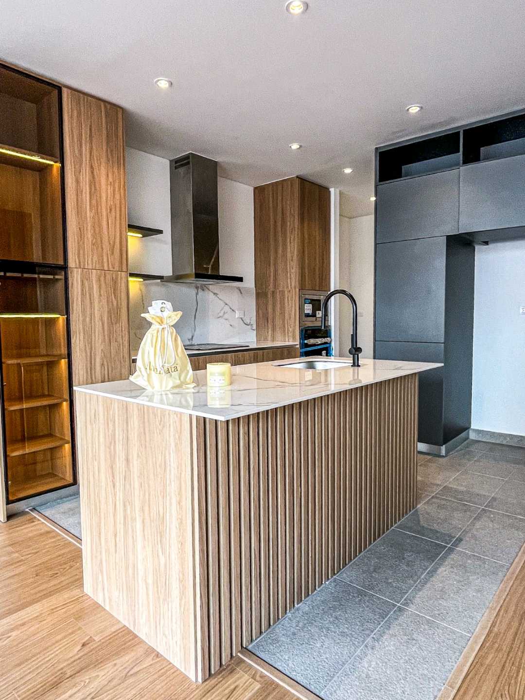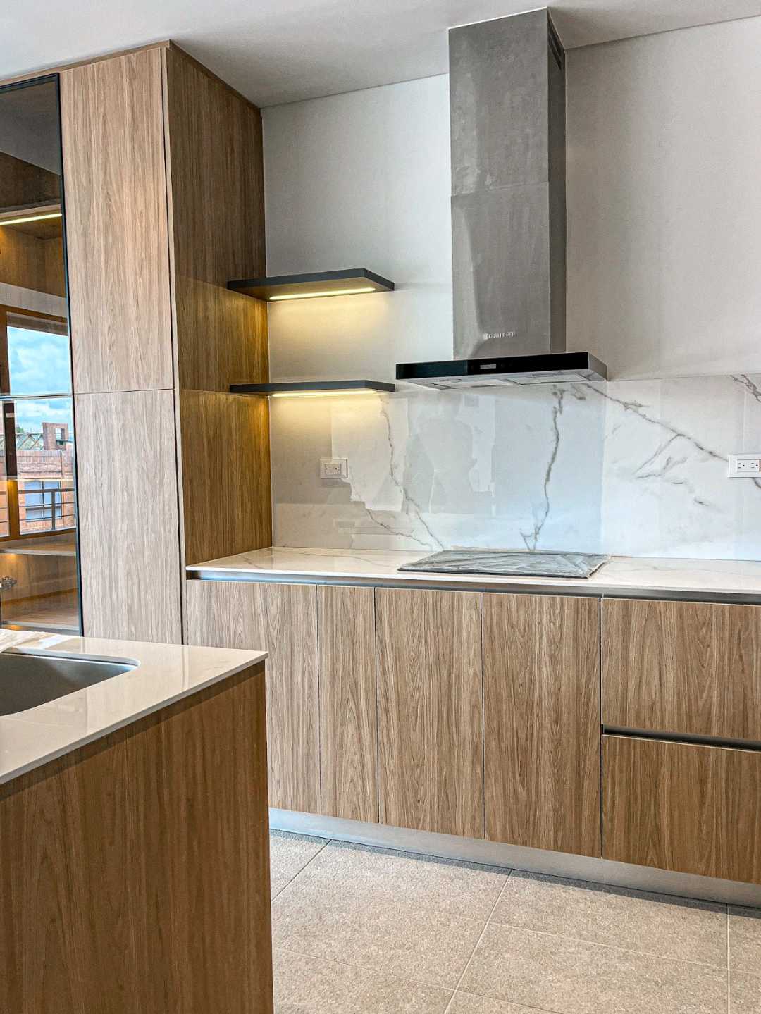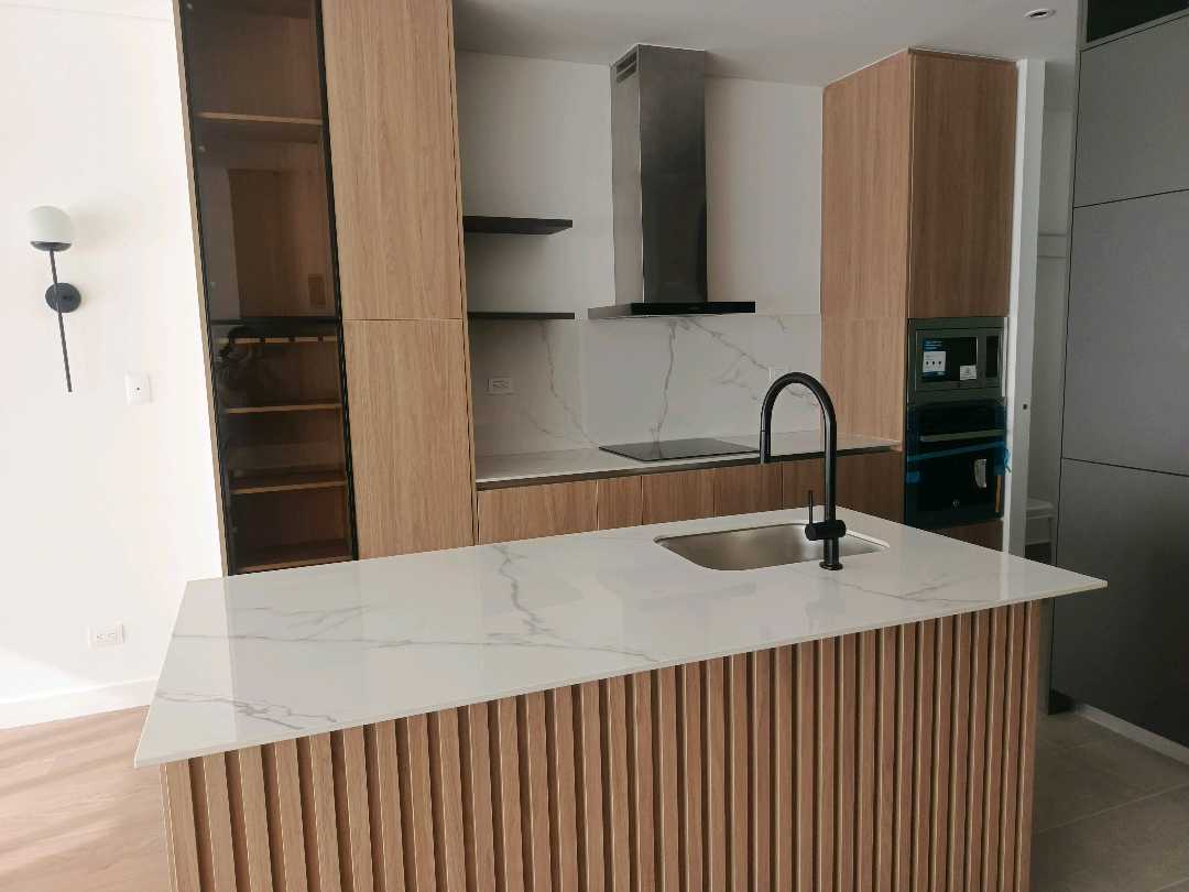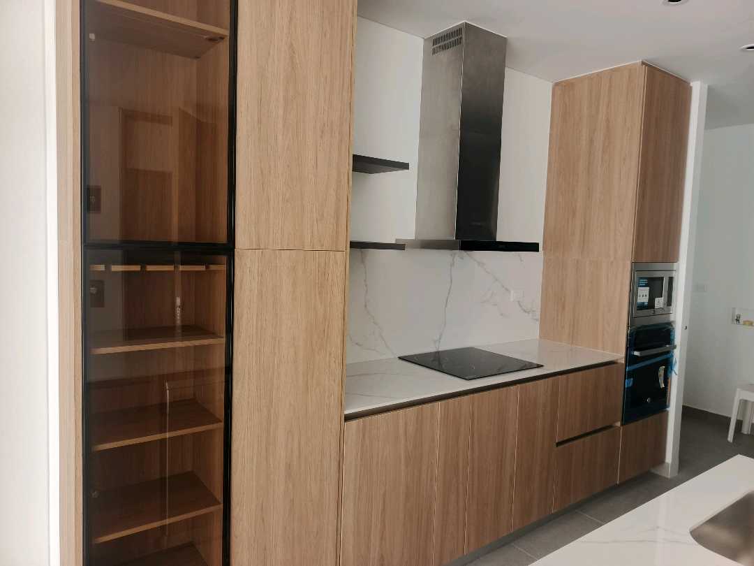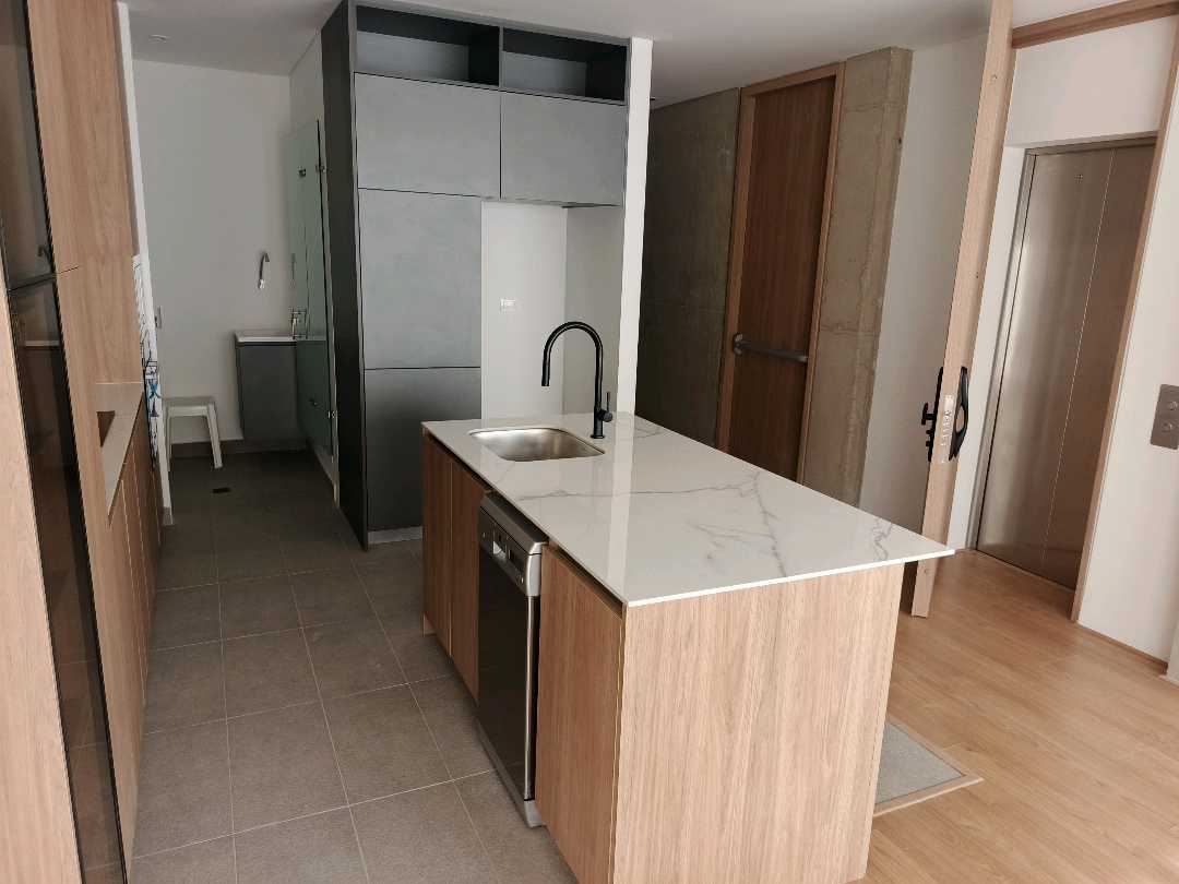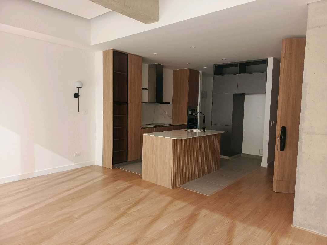 La zona social se integra con una cocina integral de alto nivel, equipada con dos hornos, lavavajillas y estufa de inducción de cuatro puestos, ideal para quienes disfrutan de la funcionalidad y el diseño contemporáneo. La altura libre de 2.65 metros aporta una sensación de amplitud y elegancia, reforzada por pisos laminados de alta resistencia, ventanería termoacústica y acabados cuidadosamente seleccionados, como muebles en chapilla de madera y herrajes importados.
