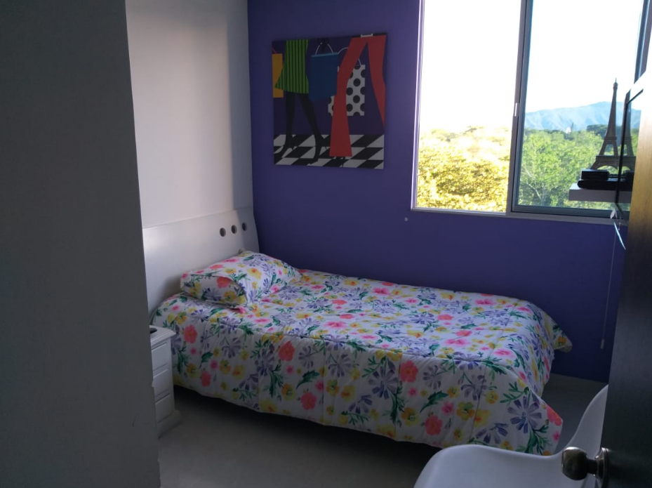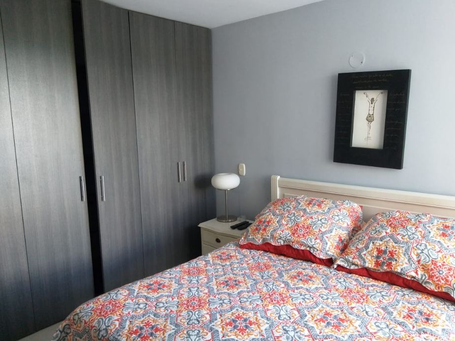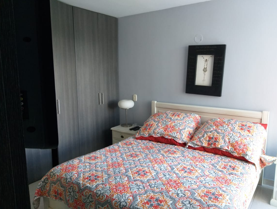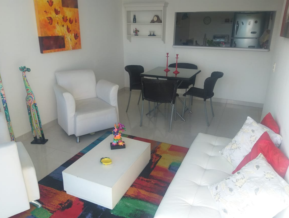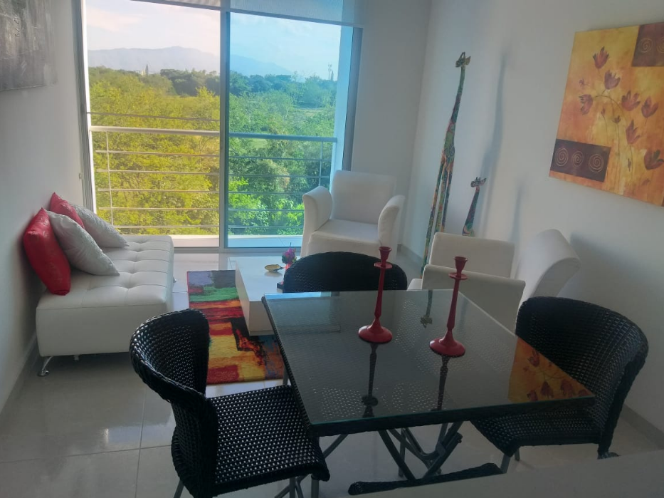 Rento hermoso apartamento amoblado por días, semanas, meses o año, en septimo piso con ascensor, cuenta con un área de 65M2 con vista panorámica, totalmente dotado, con capacidad para cuatro personas, cuenta con tres habitaciones, (la habitación principal con baño) baño de habitaciones, todas las habitaciones cuentan con closet de piso a techo, hall de alcobas, sala comedor con balcón, cocina con zona de lavandería, excelente iluminación natural, mosquetero en todas las ventanas, un parqueadero cubierto. En conjunto residencial campestre cerrado, Cuenta con Minimarket, panadería, recepción y vigilancia las 24 horas, salón social, zona de BBQ, parque infantil, parque bio saludable, piscinas con parque acuático infantil, dos ascensores. El valor de renta por día es de $250.000 para hasta cuatro personas, esta renta es mínimo por 6 noches, la renta parcial por un mes es de $ 2.500.000 incluida la administración, servicios de WI-FI, TV, gas, energía y agua para hasta 4 personas