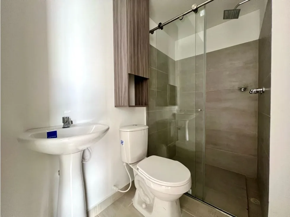 2 baños, uno en habitación principal y otro social. Ambos con muebles y mesón salidas de agua caliente y divisiones en vidrio templado de 8mm.