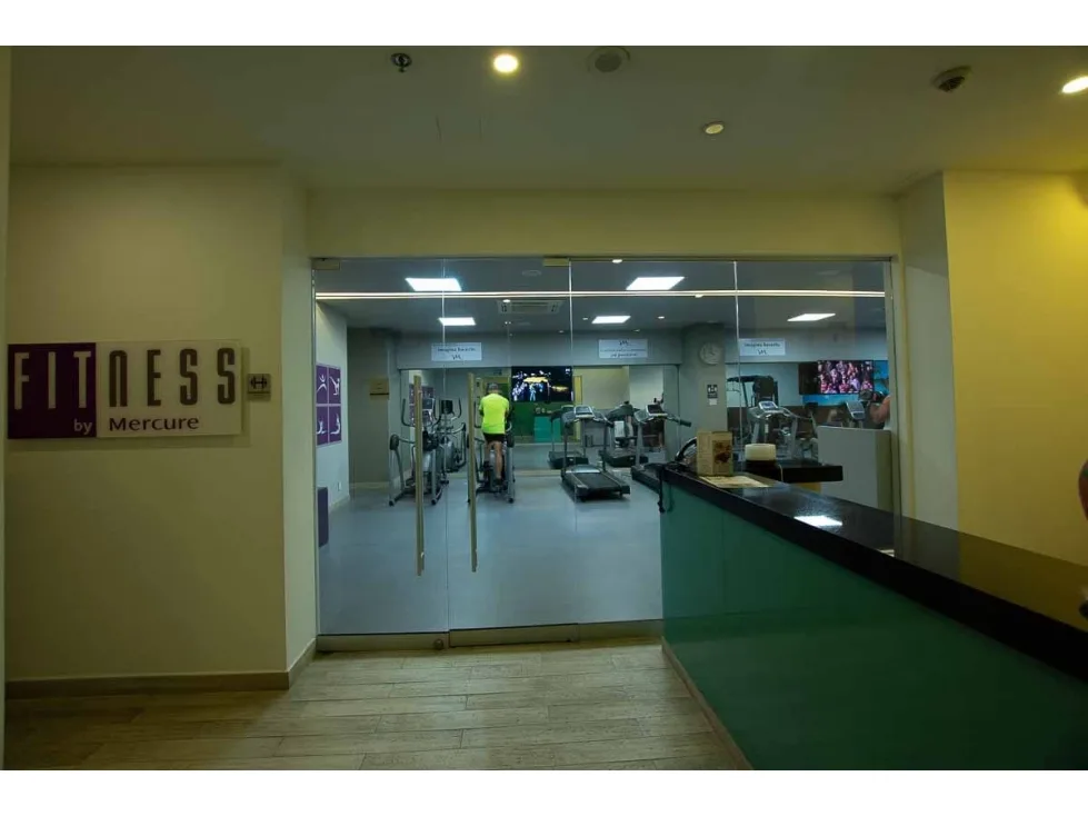 Piscina, gimnasio y zonas verdes con árboles frutales.