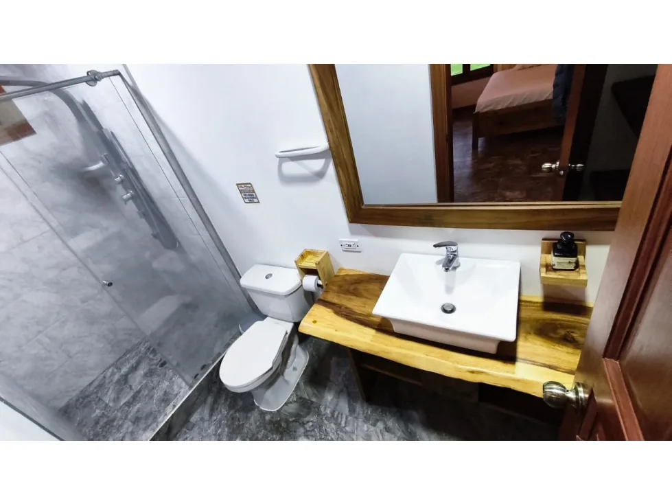 Gran sala de usos múltiples con baño social y balcón con vista panorámica hacia la piscina y el entorno natu