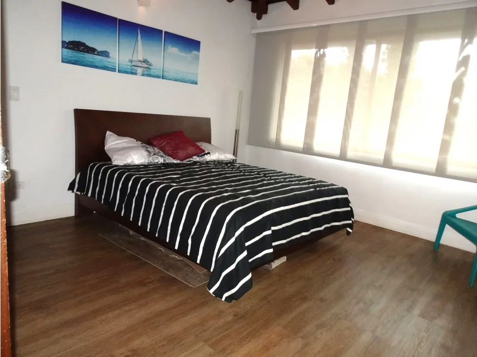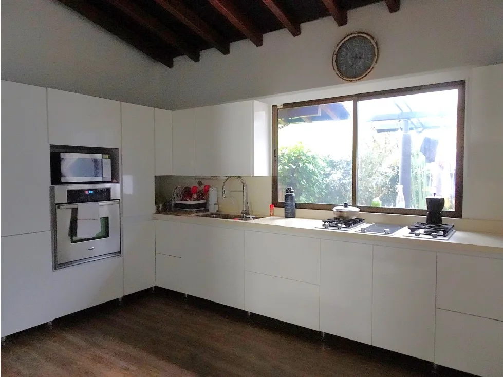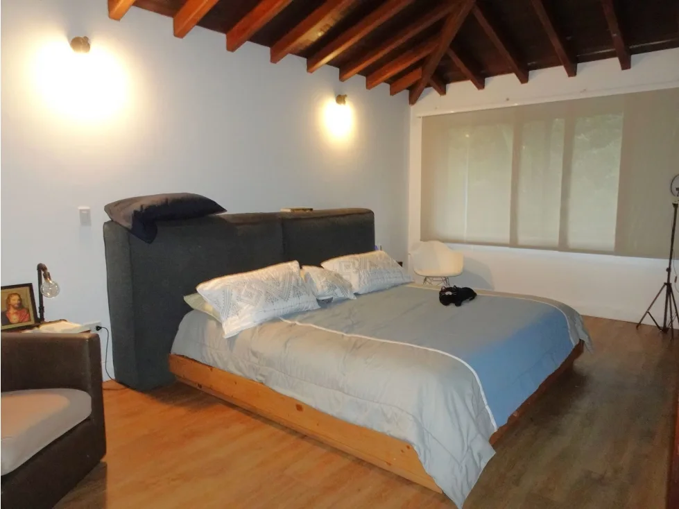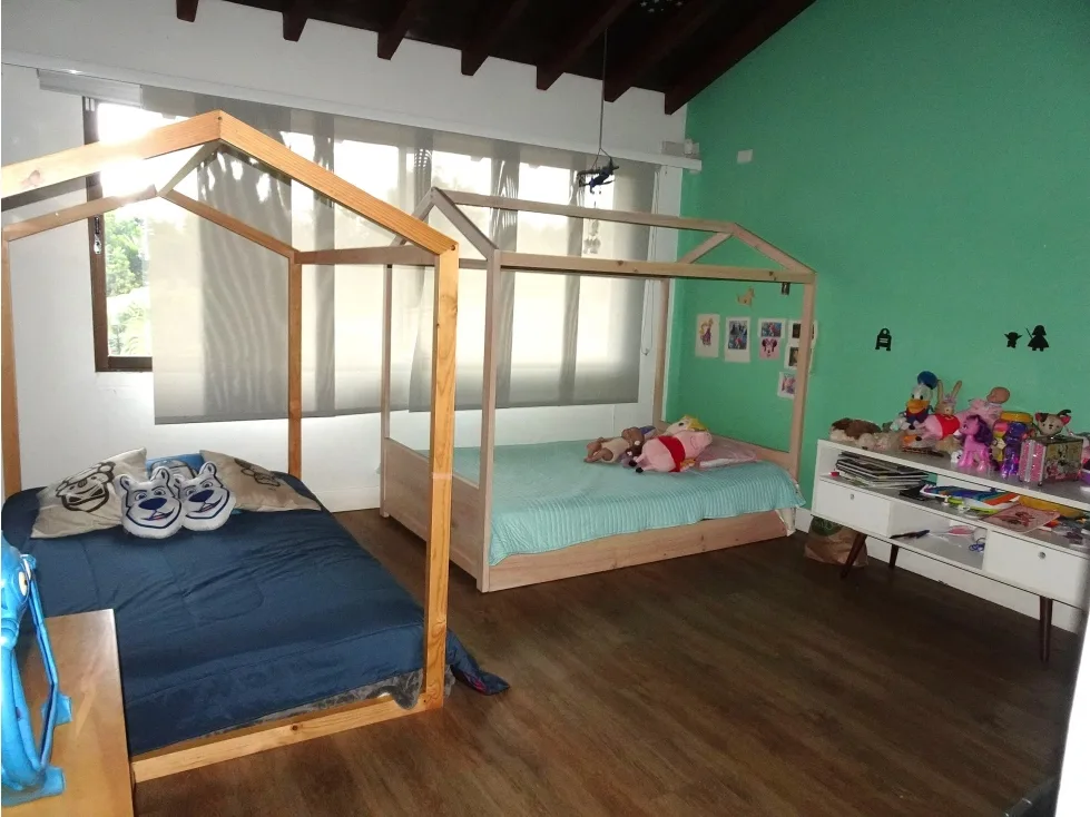Primer nivel: Cocina integral. Salón principal y salón comedor con gran amplitud. Dos alcobas, cada una con baño privado y closet. Habitación de servicio con baño. Cuarto de ropas independiente. Baño social. Closet de lino. Parqueadero techado para 2 vehículos y sin techo para aproximadamente 5 vehículos adicionales. Segundo nivel: Salón para televisión. Alcoba principal con baño privado, vestier y puerta blindada. Alcoba auxiliar con closet. Closet de linos. Áreas comunes de la unidad: Salón social, cancha múltiple y sendero para caminar. La casa está rodeada de hermosos jardines, ideales para disfrutar de la naturaleza. Además, cuenta con un cuarto de jardín con baño y el mantenimiento de las zonas verdes está incluido en el arriendo, a cargo del propietario. Ubicación privilegiada cerca al Liceo Francés de Medellín, Colegio Theodoro Hertzl y Universidad EIA.