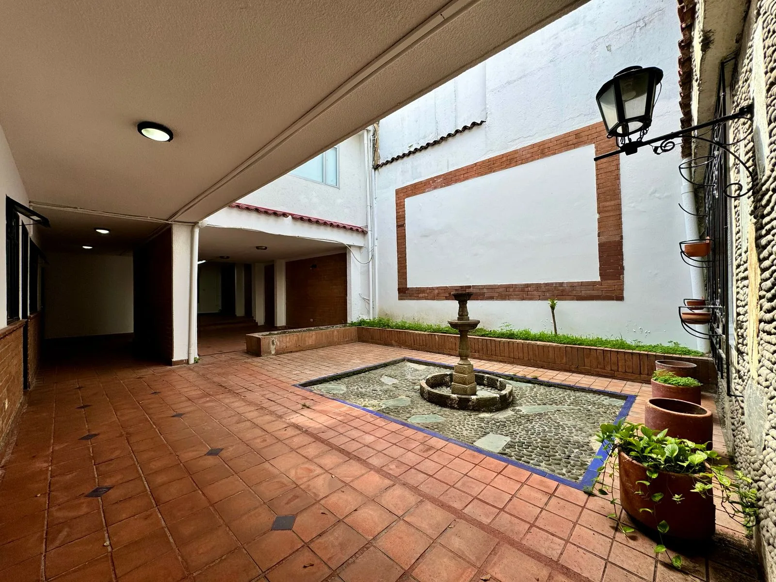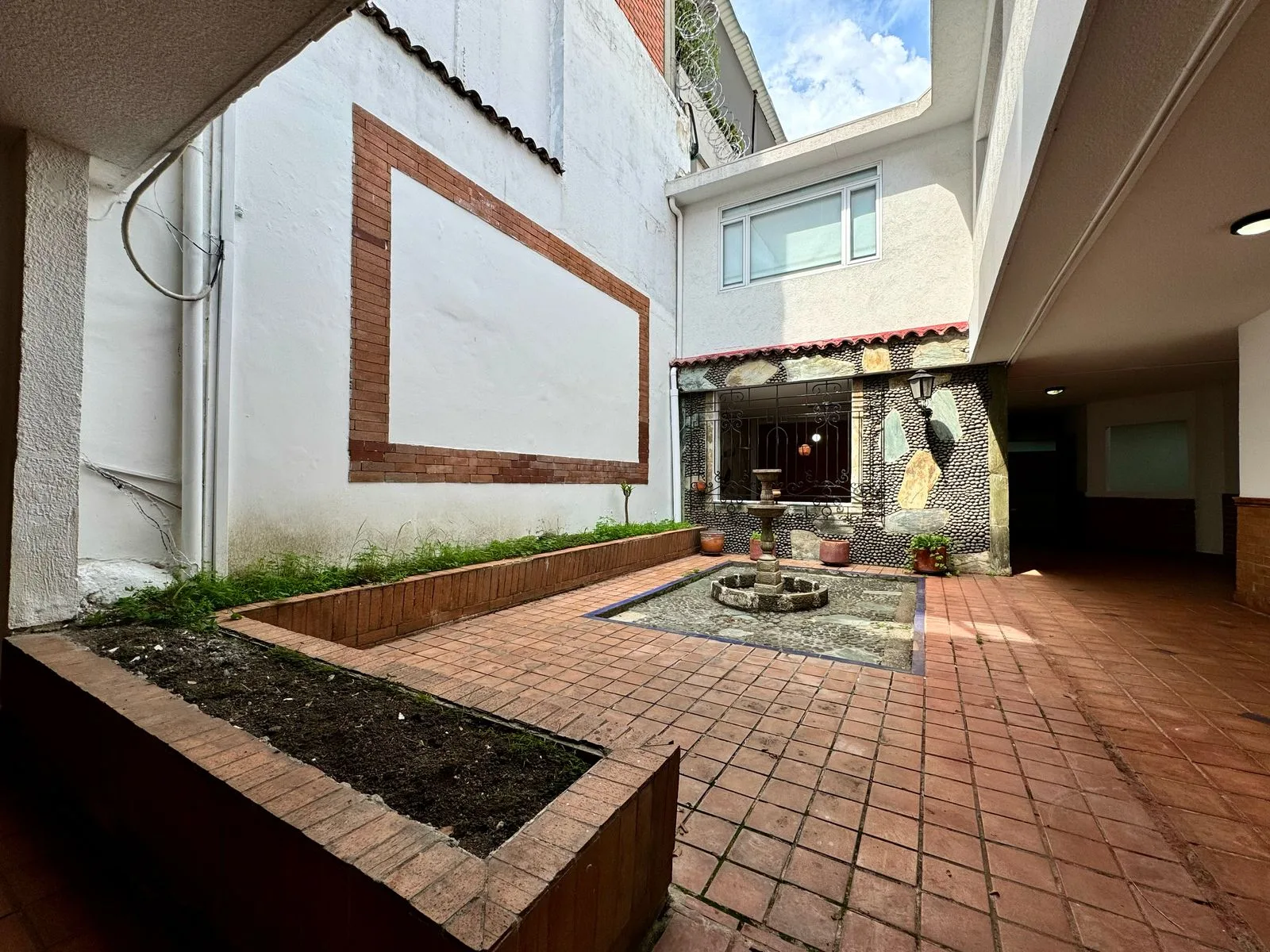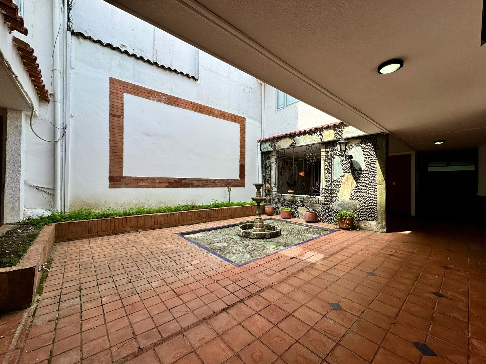 • Espacio de esparcimiento al aire libre con fuente decorativa, ideal para áreas de descanso