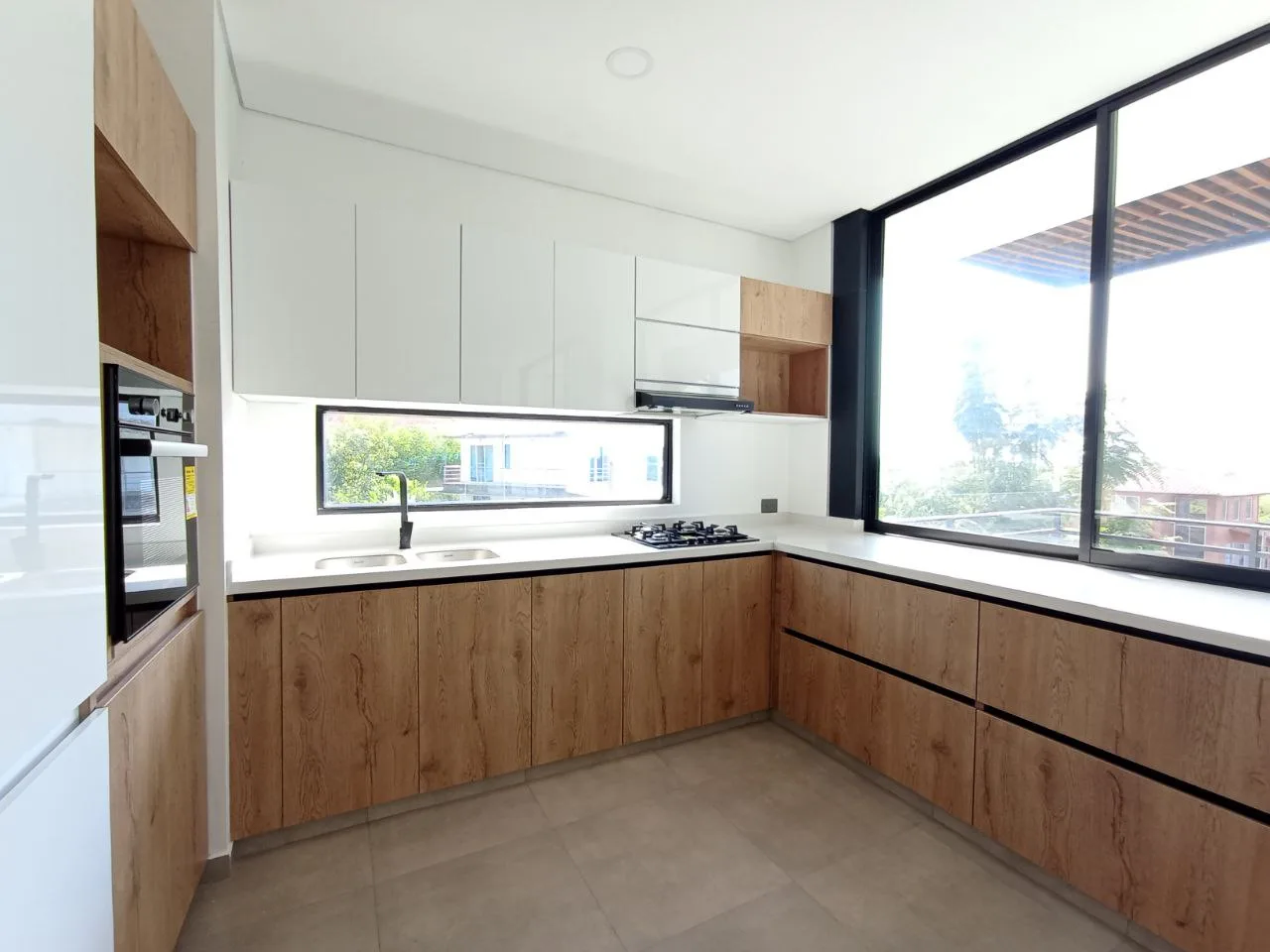 Esta propiedad está distribuida en 3 niveles; en el nivel intermedio se encuentra la sala comedor de 2 ambientes, balcón con 2 puertas de acceso que brinda una hermosa vista, cocina integral amplia, completamente equipada con acabados en madera, mesón en mármol, espacio para nevecon, alacena, gabinetes superiores e inferiores, espacio para microondas, estufa empotrada, horno y campana extractora, además de una vista a la parte exterior del inmueble; baño social, con ducha y gabinetes en la parte inferior del lavamanos; 2 habitaciones bastante amplias, con ventana grande y con closet cada una; una de las habitaciones tiene baño con ducha. Todo el espacio cuenta con excelente entrada de ventilación e iluminación natural.