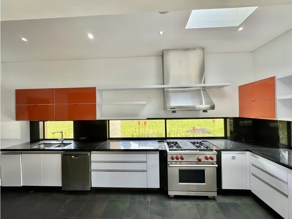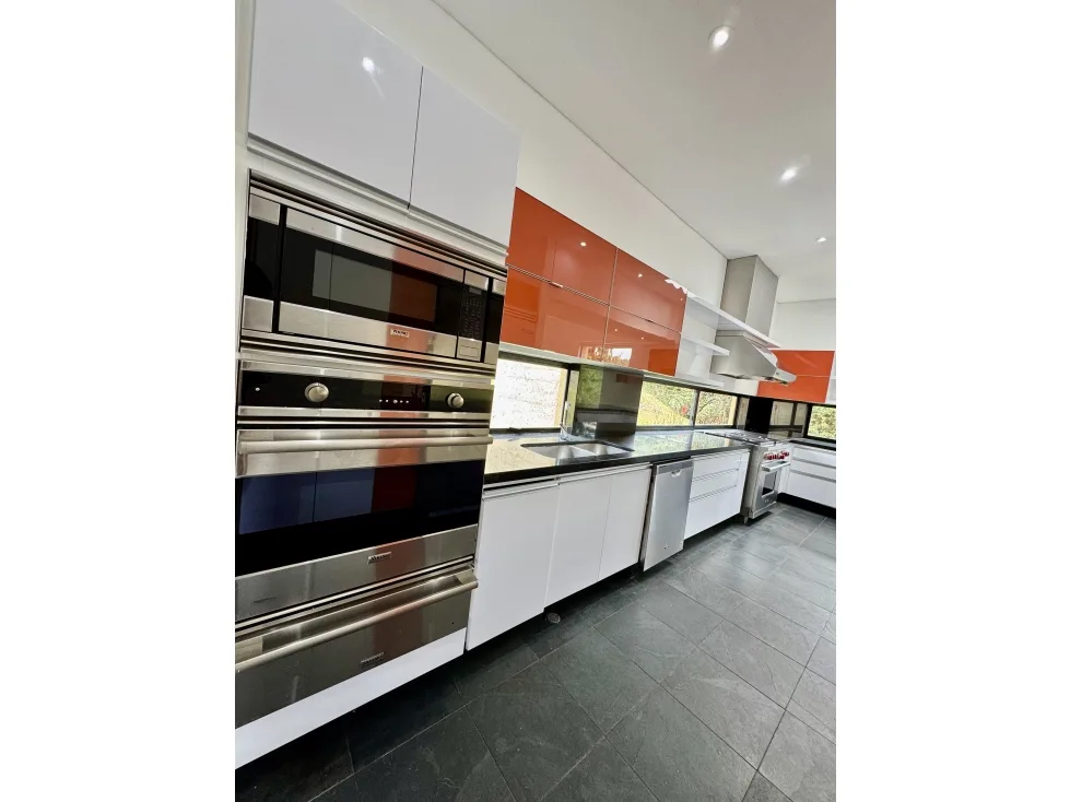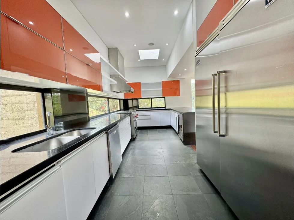 Cocina tipo industrial equipada con nevera doble puerta, estufa industrial, torre de hornos, cava de vinos y electrodomésticos incluidos