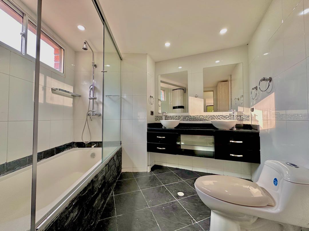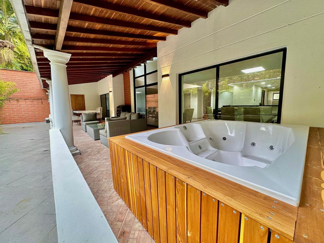 Arriendo casa con terraza y balcón. El Poblado, Sector El Tesoro. - Unidad de fácil acceso, Sector La Calera, El Tesoro, cerca de vías principales como La Transversal Superior. Inmueble de lujo con agradables espacios, doble altura, amplia terraza; una parte cubierta. - Área: 330M2 - Primer nivel: . 2 Salas . Chimenea . Jardín . Zona de BBQ, . Terraza cubierta . Jacuzzi . Comedor . Cocina abierta . Zona de ropas . Alcoba de servicio con baño. . Baño social . 2 Parqueaderos cubiertos y 2 Parqueaderos descubiertos Segundo nivel: . 3 alcobas familiares cada una con baño . Estudio o sala de TV con balcón - . Unidad cerrada . Portería 24/7 . Parqueaderos de visitantes . Zonas verdes - • Precio alquiler: $ 13.500.000= COP -