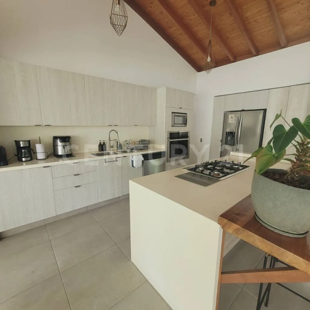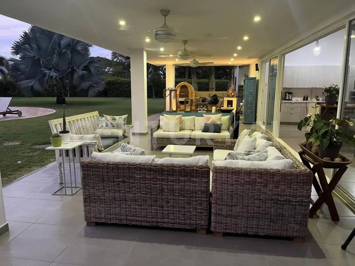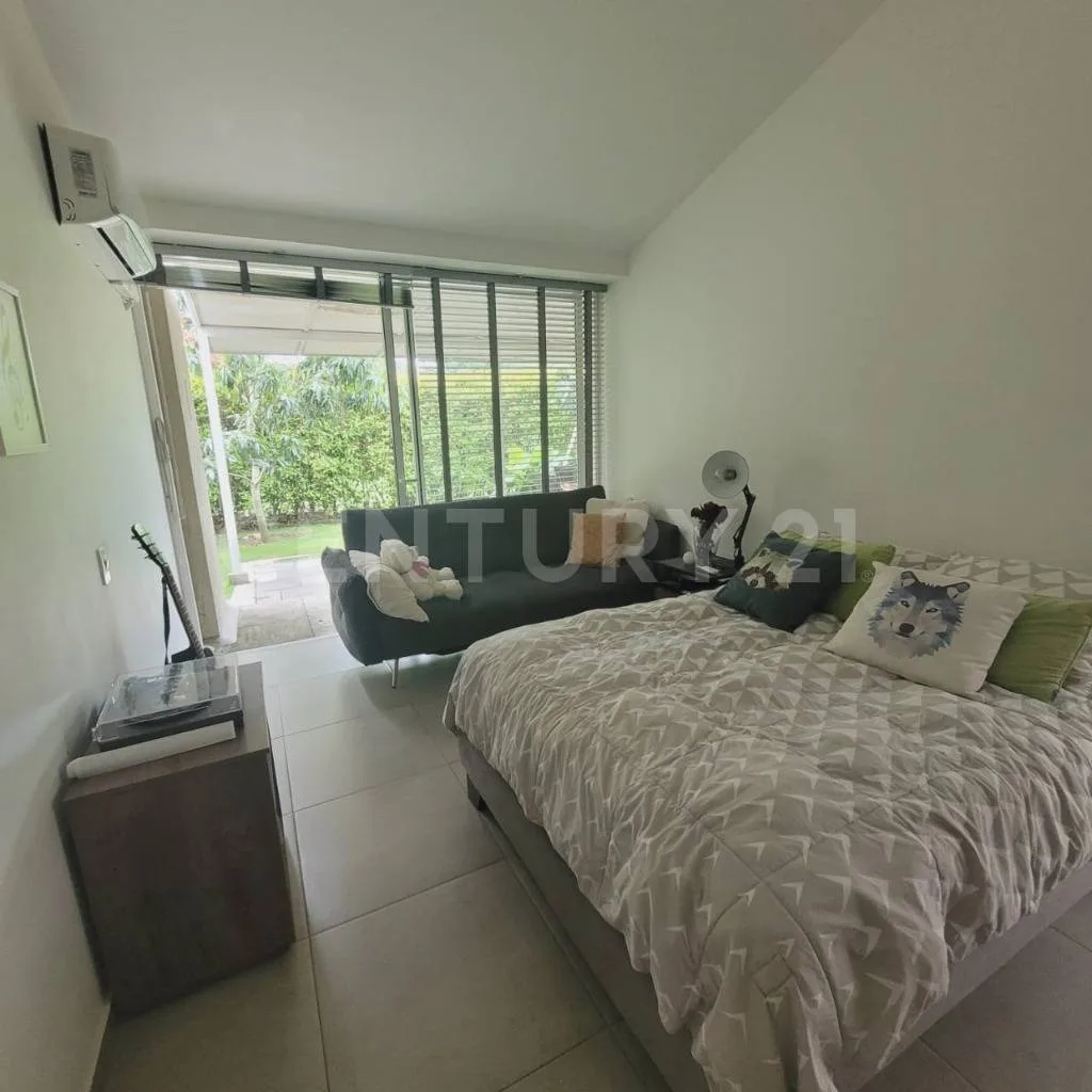 Se alquila linda y amplia Casa de 268 M2 en Condominio Forestal Club Lote 55 cuyo techo es a Doble altura, Ventanales con salida al jardín o a terraza auxiliar, en todos los espacios, 3 Habitaciones cada una con su walking clóset y baño, Una de ellas se integra con un estudio súper amplio con una gigante biblioteca, Baño social, Sala de TV, Sala comedor, Cocina abierta con lavadora de platos, nevera para vinos y (2) alacenas, Amplia zona de lavandería con espacio para lavadora y secadora, Terraza social de 65 mt2 con horno de leña, asador, caja china, Baño y ducha exterior y Cuarto del servicio con baño. _x000D_