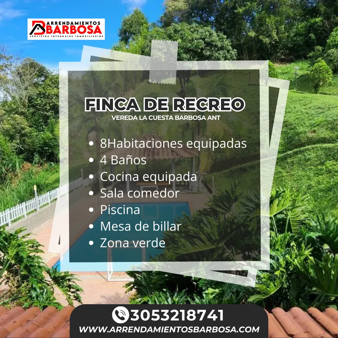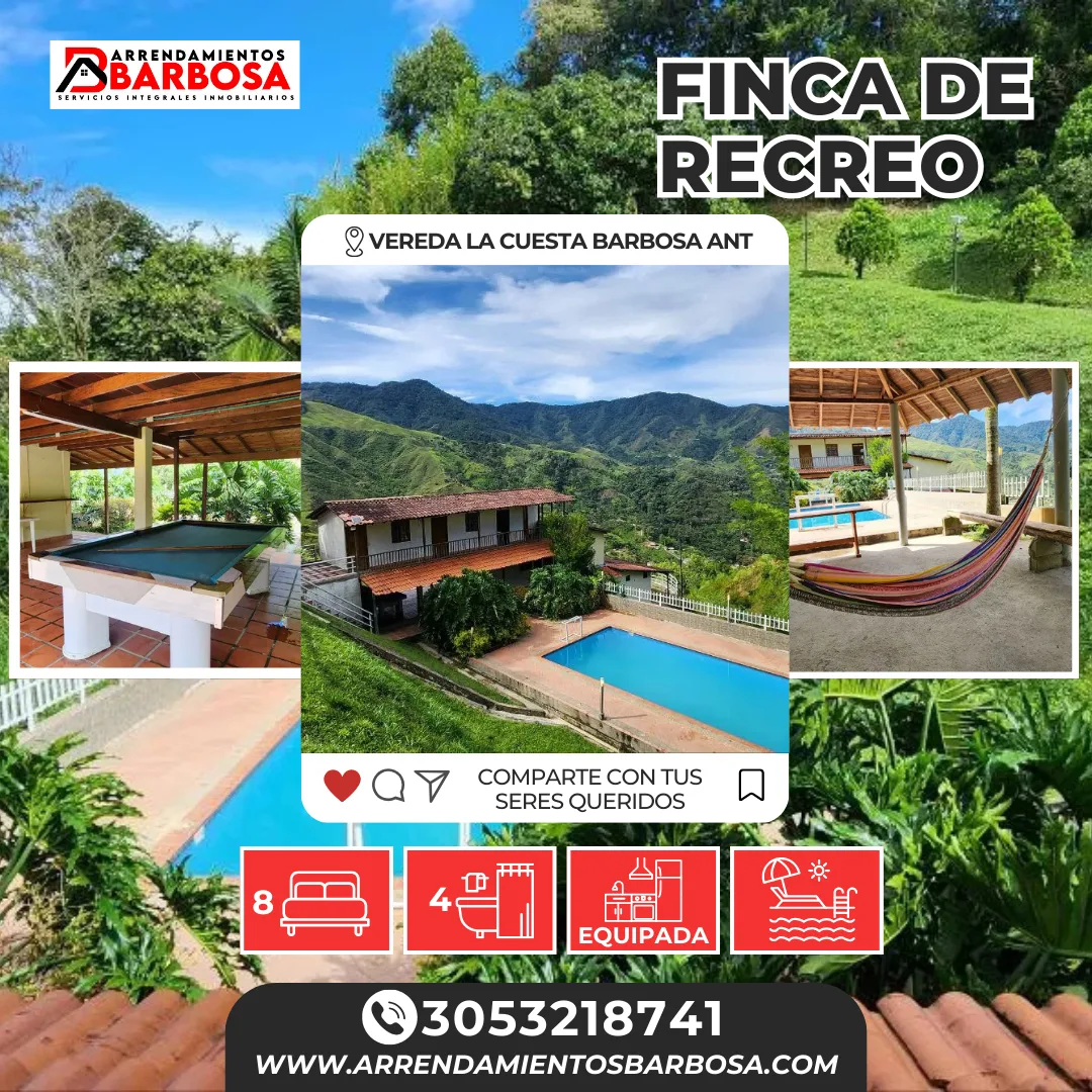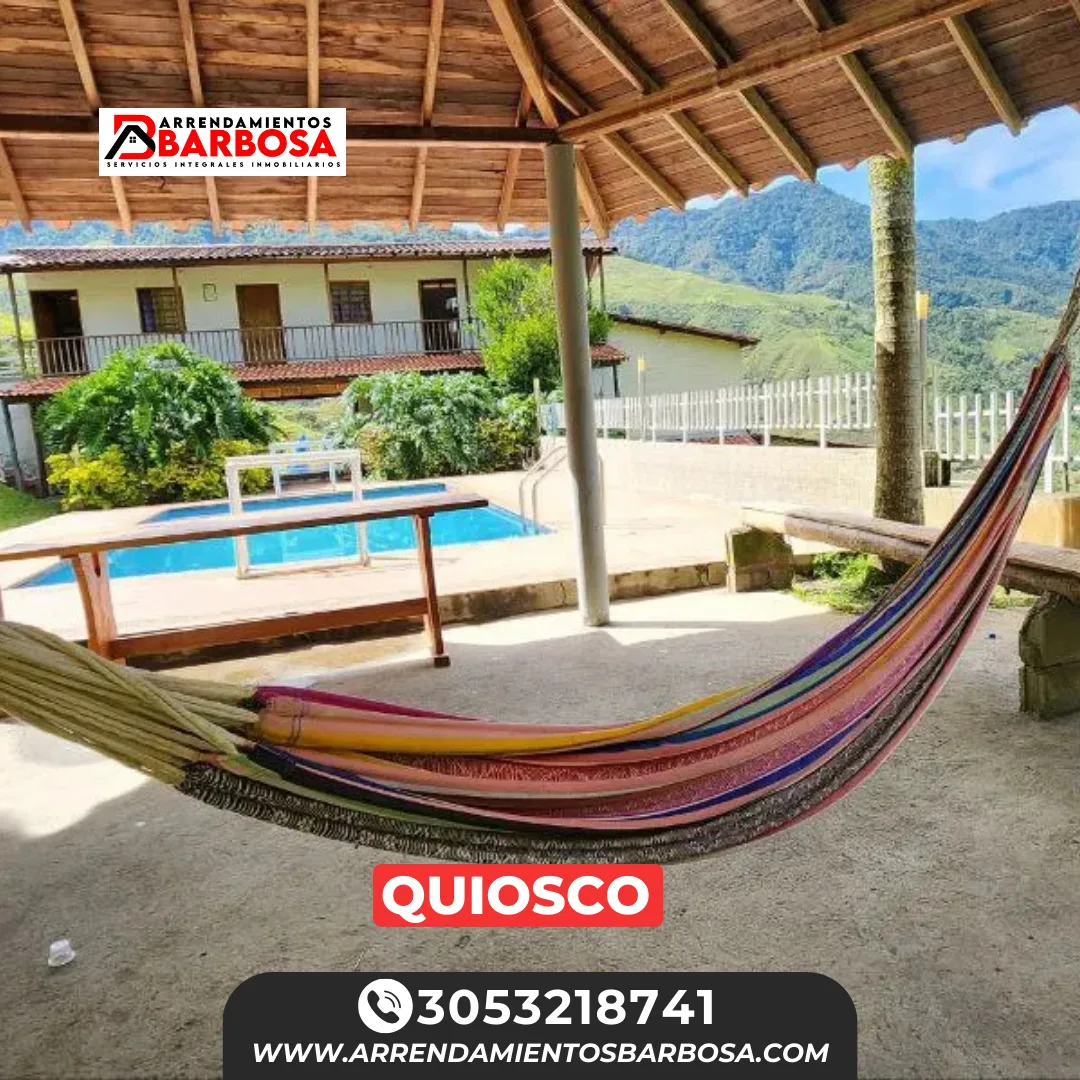 Quieres descanso, tiempo relajación, respirar aire fresco y compartir con familia o amigos, con esta espectacular finca podrás hacer esto y muchas cosas mas, aprovecha y regalate este momento para ti. Finca ubicada a 16 minutos de Barbosa, acceso en riel, con capacidad par 20 personas.