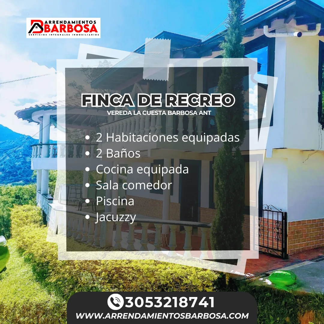 Quieres descanso, tiempo relajación, respirar aire fresco y compartir con familia o amigos, con esta espectacular finca podrás hacer esto y muchas cosas mas, aprovecha y regalate este momento para ti. Finca ubicada a 25 minutos de Barbosa, acceso en riel, con capacidad par 20 personas.