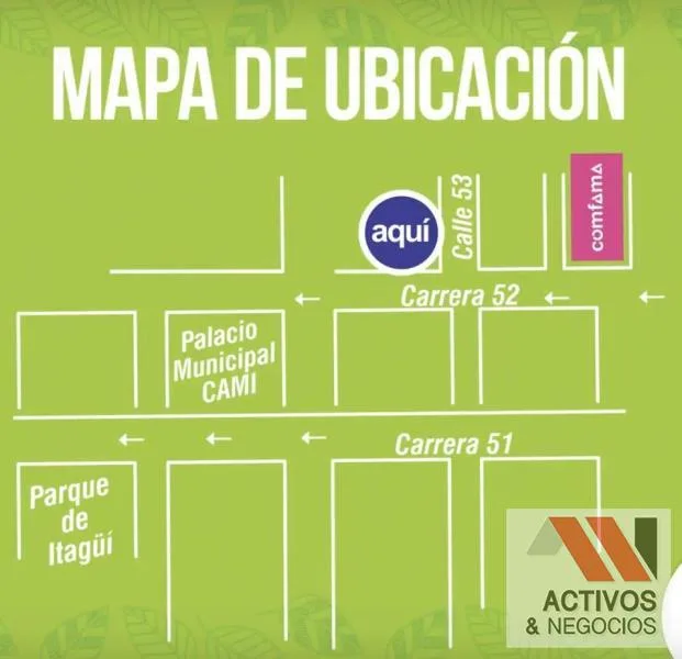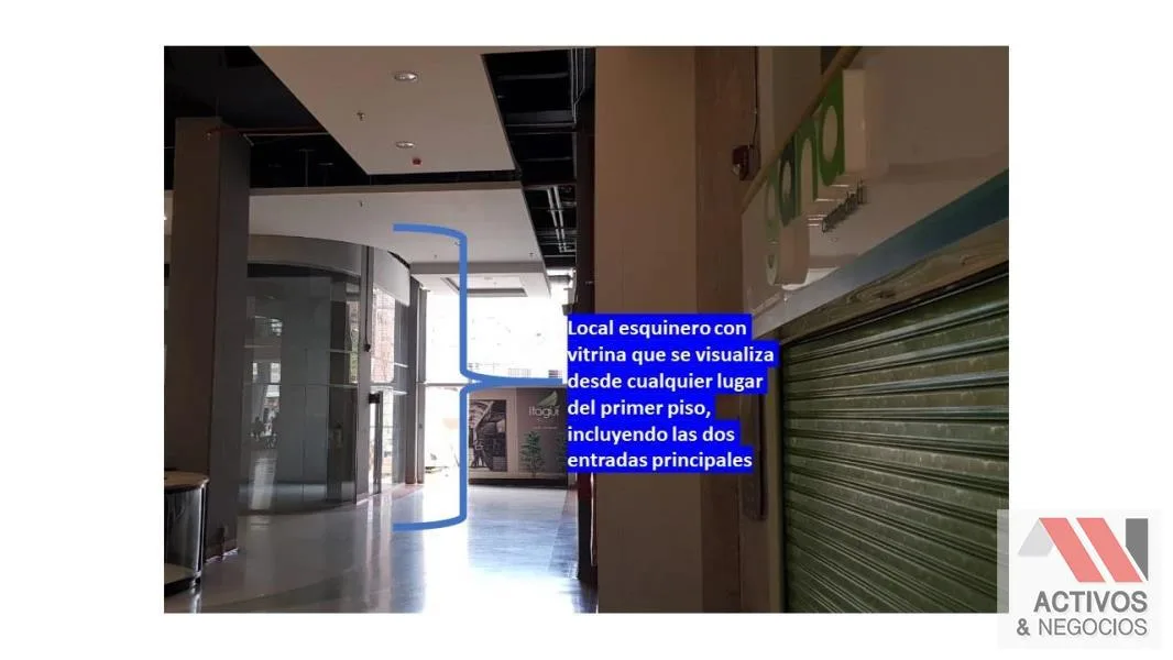 Local esquinero de 56 mtr2, en punto estratégico en el 1er piso del Centro Comercial Itagui Plaza, el cual inauguro en septiembre dely está enfocado mayormente en servicios. En el 1er piso se encuentra Gana, BetPlay, Coordinadora, Claro, Mimos, Casino WPlay. En el 2ndo está la Curaduría, SuInmobiliaria, 2 spa, entre otros. El 3er piso es de comidas, el 4to de oficinas y el 5to un gimnasio, Action Fitness. Está ubicado a 2 cuadras del parque, donde opera el gobierno del municipio y el consejo. Canon $6.150.000 más IVA.