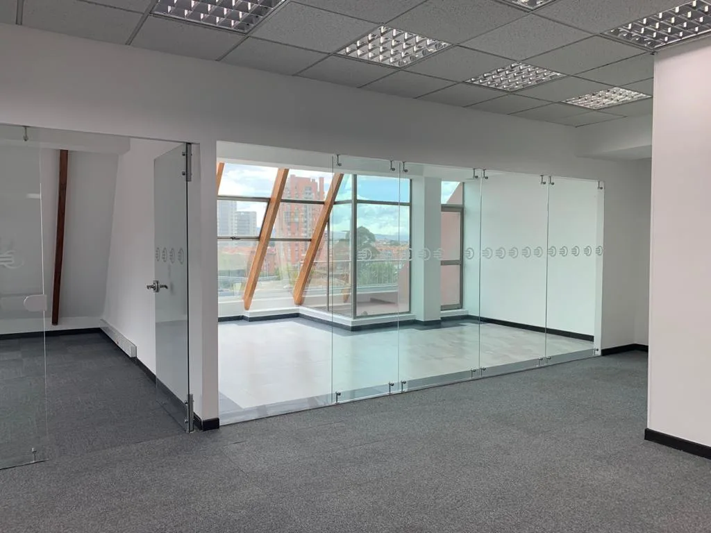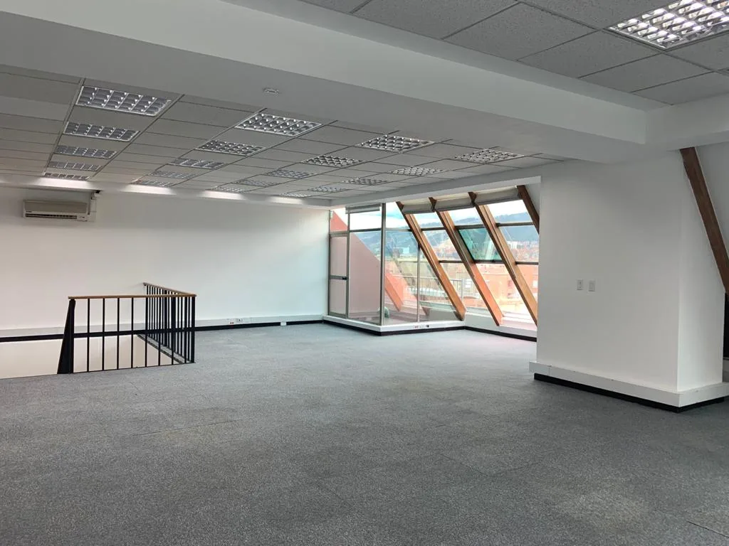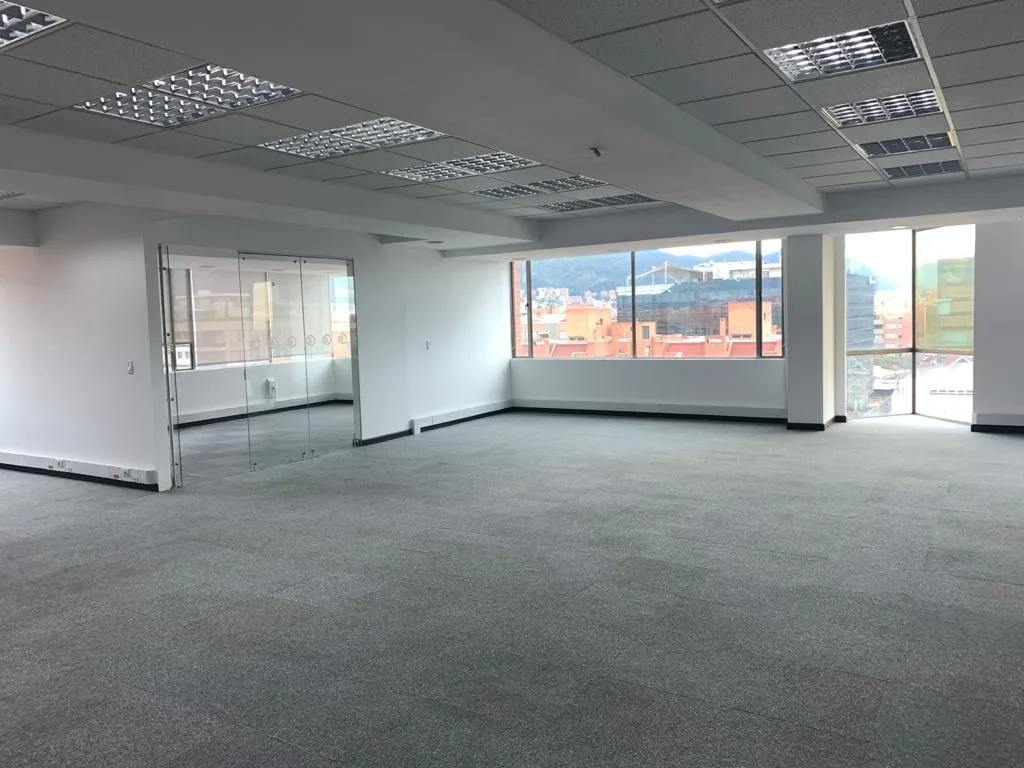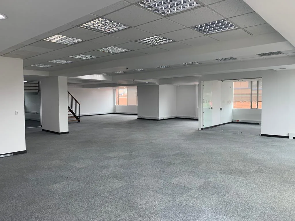 OFICINA EN 2 NIVELES, UBICADA EN EL 7 PISO DEL EDIFICIO, PISOS DE TAPETE MODULAR, CIELO RASO CON ILUMINACIÓN DISTRIBUIDA EN TODA EL ÁREA, AIRE ACONDICIONADO, OFICINA CERRADA CON VIDRIO TEMPLADO, ESPACIOS PARA GUARDAR ARCHIVO, ZONA DE CAFETERÍA, ESPACIOS PARA SALA DE JUNTAS CABLEADO ESTRUCTURADO. BATERÍA DE BAÑOS PARA MUJERES Y HOMBRES, PLANTA ELÉCTRICA SUPLENCIA TOTAL, TRES TERRAZAS PEQUEÑAS, CUENTA CON 13 PARQUEADEROS PRIVADOS Y 36 VISITANTES.
