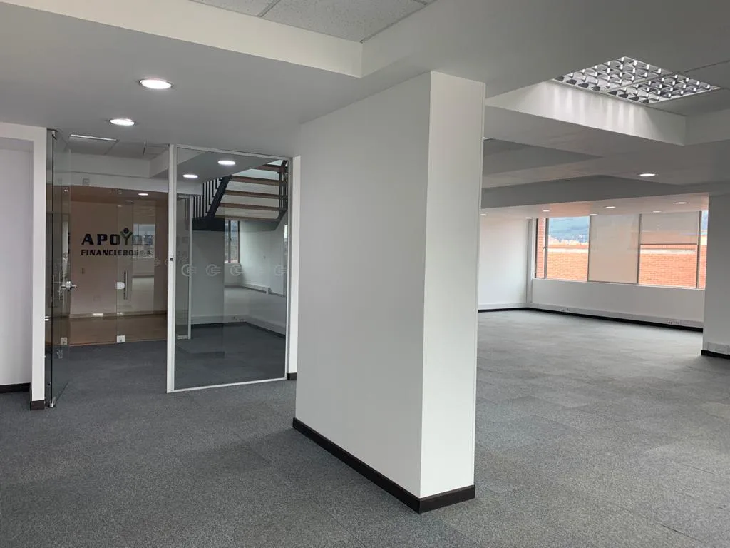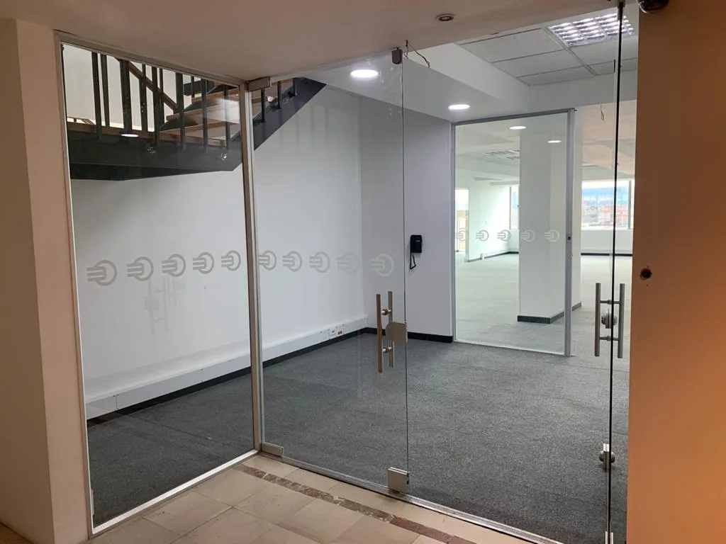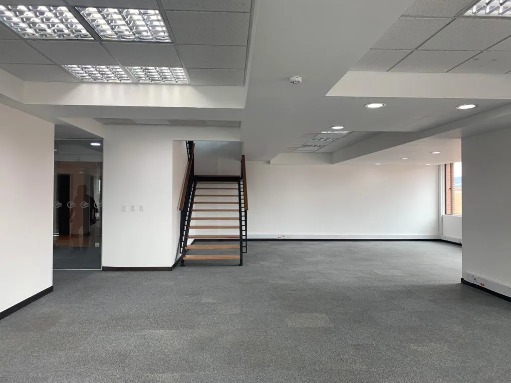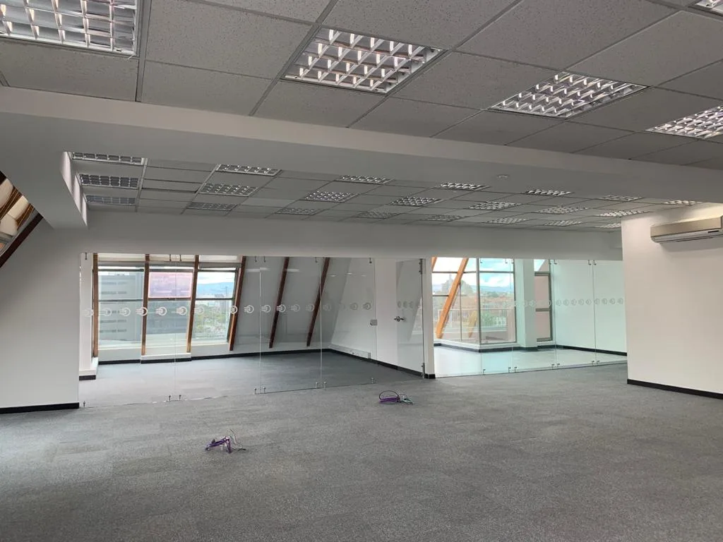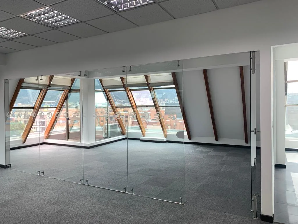 OFICINA EN 2 NIVELES, UBICADA EN EL 7 PISO DEL EDIFICIO, PISOS DE TAPETE MODULAR, CIELO RASO CON ILUMINACIÓN DISTRIBUIDA EN TODA EL ÁREA, AIRE ACONDICIONADO, OFICINA CERRADA CON VIDRIO TEMPLADO, ESPACIOS PARA GUARDAR ARCHIVO, ZONA DE CAFETERÍA, ESPACIOS PARA SALA DE JUNTAS CABLEADO ESTRUCTURADO. BATERÍA DE BAÑOS PARA MUJERES Y HOMBRES, PLANTA ELÉCTRICA SUPLENCIA TOTAL, TRES TERRAZAS PEQUEÑAS, CUENTA CON 13 PARQUEADEROS PRIVADOS Y 36 VISITANTES.