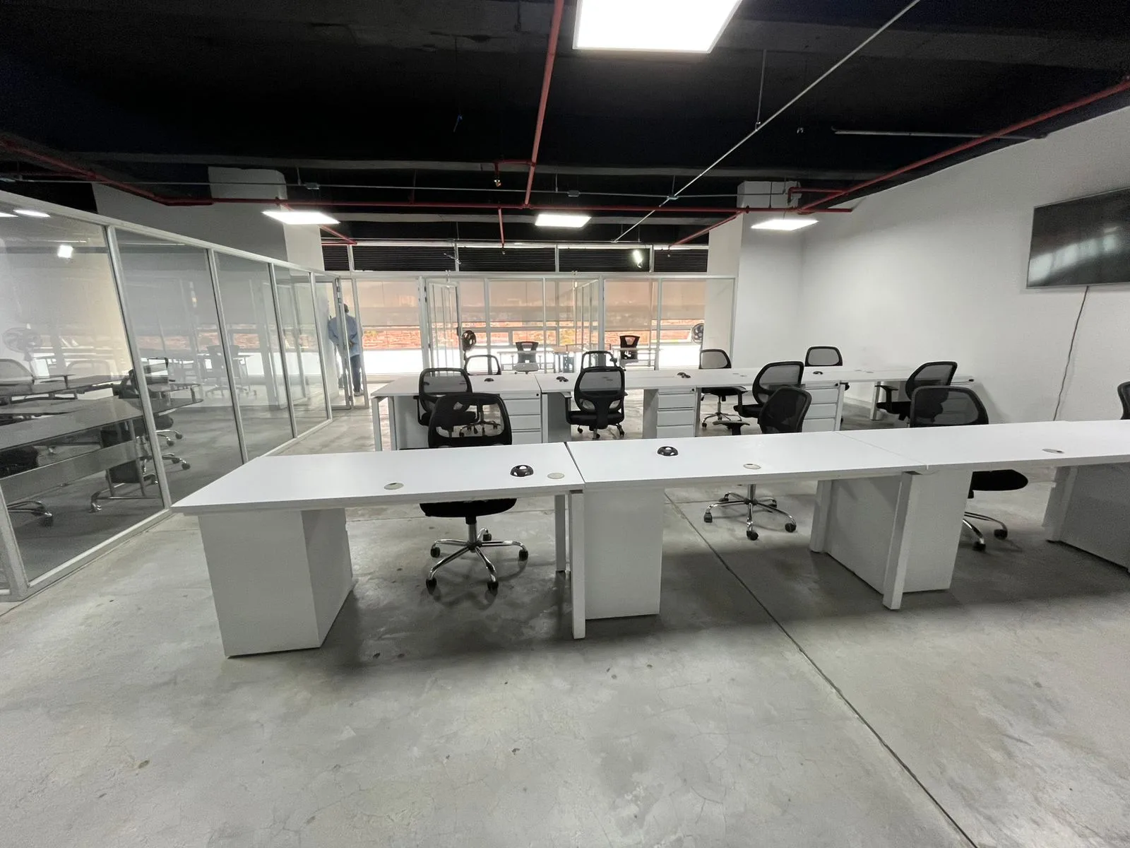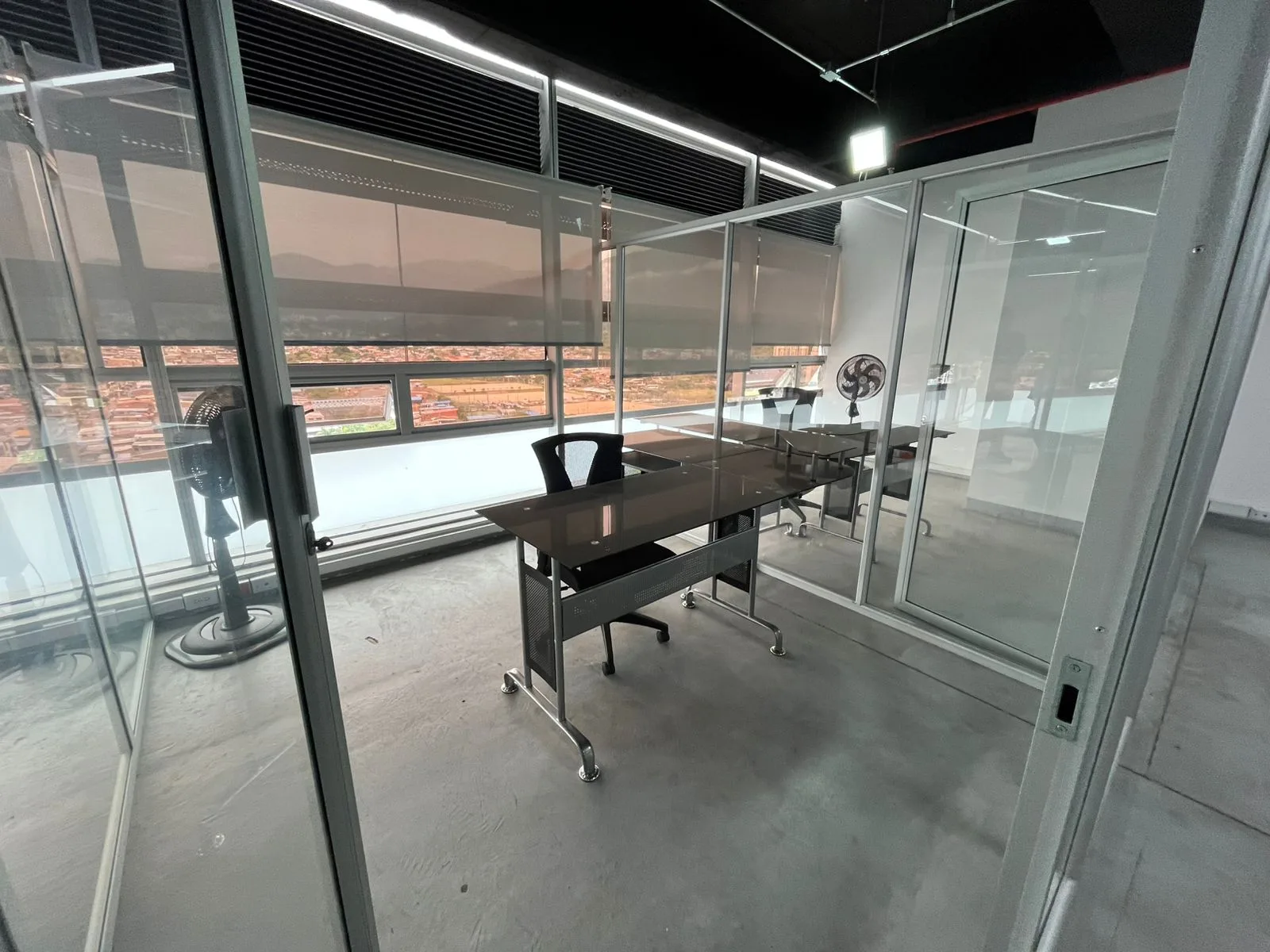 Moderna y amplia oficina de 130 m². Cuenta con una magnifica vista panorámica e iluminación natural, 4 oficinas, un total para 24 personas para laborar, archivo, cocineta y nevera.